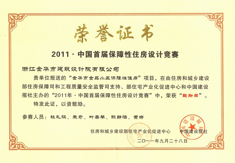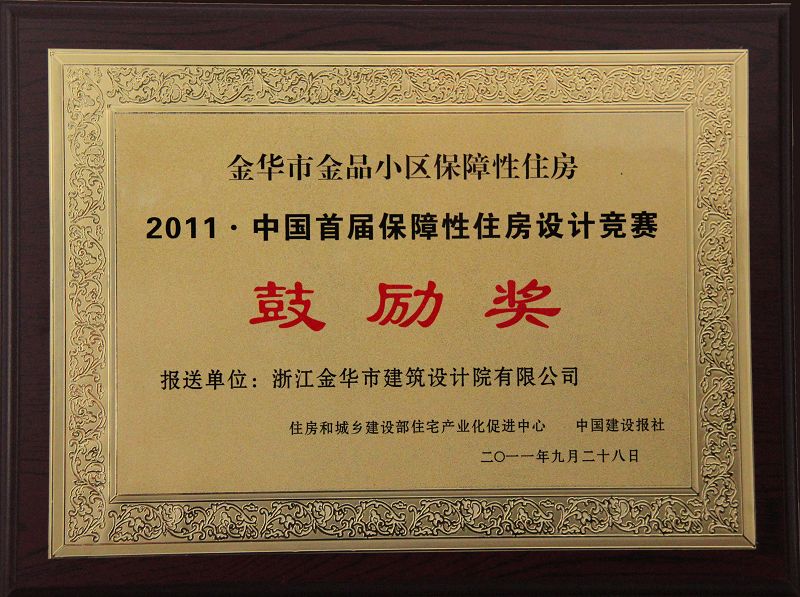 本院設(shè)計的“金品小區(qū)保障性住房”在住房和城鄉(xiāng)建設(shè)部舉辦的“2011年·中國首屆保障性住房設(shè)計競賽”中獲獎,并于第十屆中國國際住宅博覽會上舉行頒獎典禮。本次競賽的主題定為“以人為本,安居樂業(yè)”。旨在更好的推廣優(yōu)秀的保障性住房規(guī)劃設(shè)計方法,促進保障性安居工程設(shè)計和建設(shè)的標(biāo)準(zhǔn)化和模數(shù)化。